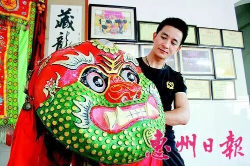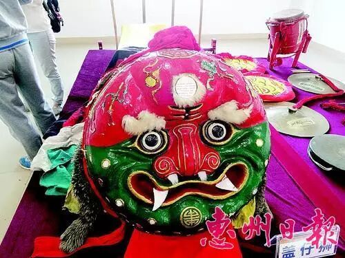 在惠州市第四届民间艺术博览会上,盖仔狮传承人陈志豪的表演让人感受到了其魅力。除了盖仔狮,在文化传承的道路上,陈志豪付出了许多汗水和努力。他希望在舞狮习武的同时,让传统文化发扬光大。 “相传明末清初时,从海陆丰过来一和尚,和尚在庙堂里教人功夫。这名和尚就是盖仔狮的祖师爷。老师傅早有交待,海陆丰是师兄的地盘,我们的狮队不要到那边演出,只能邀请他们的狮队过来表演。 ”因此,尽管表演当天,来自汕尾、铁涌和长排村的3支狮队相遇,但为了尊重汕尾的狮队,本地狮队并没有拿出狮头来,只将锣鼓搬了出来。表演结束后,陈志豪向记者透露了这个“外行人看热闹,内行人看门道”的内幕。盖仔狮所用的狮头,各地也不一样。“汕尾和陆丰是青头白额的‘刘备’,海丰是黑头青脸的‘张飞’,我们是红额青面的‘关羽’。” 陈志豪介绍,据考证,盖仔狮源于明末清初,叫法甚多,古称“金狮”,台湾同胞称作“感仔狮”,香港同胞称作“貔貅”,由福建传入陆丰、海丰、惠东稔山、港台一带,至今已有三四百年历史,被尊称为狮王。 稔山长排的盖仔狮造型古朴,与其它狮最大的不同是其红额青面,头部状似锅盖,因而得名“盖仔狮”。细看其面部,口阔目大鼻短,眉宇间写有“王”字。虽其貌不扬,但盖仔狮在狮班中地位最高。陈志豪说,其他狮队与之相遇,必须向盖仔狮行参拜大礼,绕侧而过。在粤东地区有“红额青面,狮班免掠”之说。 “免掠”是“不用比”的意思,可见其武艺高强、地位崇高。譬如,不论哪个村若有盖仔狮在表演,其他狮类是不敢进村的,只有等“狮王”表演结束离开方敢进村。反之,其他狮类在一个村里表演,如果“狮王”突然闯进,只有自觉中止表演,选择离开。其他种类的狮班与之相遇,要偃旗息鼓,乖乖地站在旁边让道等候“狮王”通过,有的干脆改道避之,可见盖仔狮地位特殊。 长排盖仔狮以憨直拙朴、粗犷自然见长,在高亢粗犷的铜锣皮鼓伴奏下,抑、扬、开、合、滚、跃、抢……至今还保留着传统的表演方式。舞狮表演分两部分,上半场“行狮”,进行狮舞表演;下半场“打拳”,即武术表演。下半场的武术表演包括单人打拳、双人对打,也有单人棍术、双人对打棍术、搬刀、舞尖串、尖串对铁尺、辗藤牌,最后是集体持棍对打。随着吹、打乐节奏的加剧形成表演的高潮,场面异常激烈、逼真。 盖仔狮狮头。 资料来源 惠州新闻 部分图片来源网络 由惠东论坛整理编辑 希望这项传统民间艺术能够被更多的人传承下去!发扬光大!